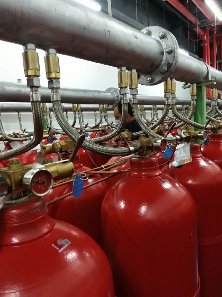 首先火災(zāi)探測(cè)器報(bào)警,消防控制中心接到火災(zāi)信號(hào)后,啟動(dòng)聯(lián)動(dòng)裝置(關(guān)閉通風(fēng)口、停止空調(diào)等),延時(shí)約30s后,打開啟動(dòng)氣瓶的瓶頭閥,利用氣瓶中的高壓氮?dú)鈱缁饎﹥?chǔ)存容器上的容器閥打開...